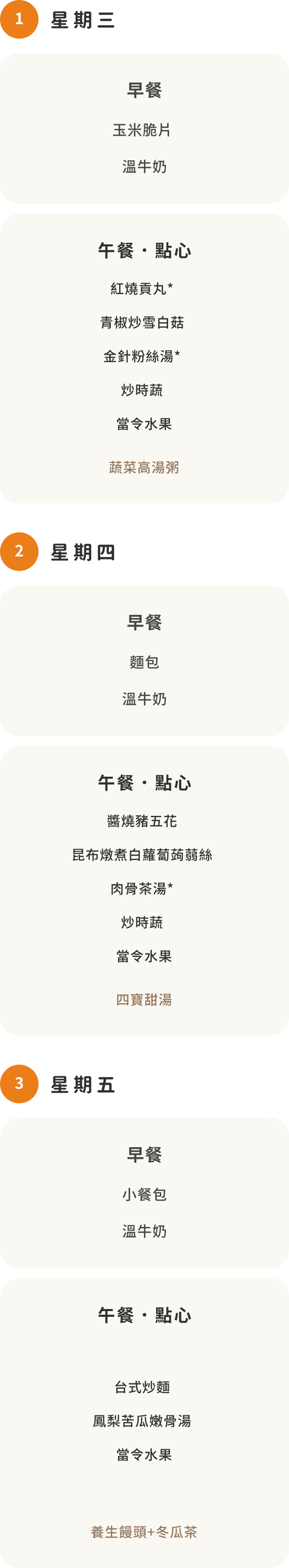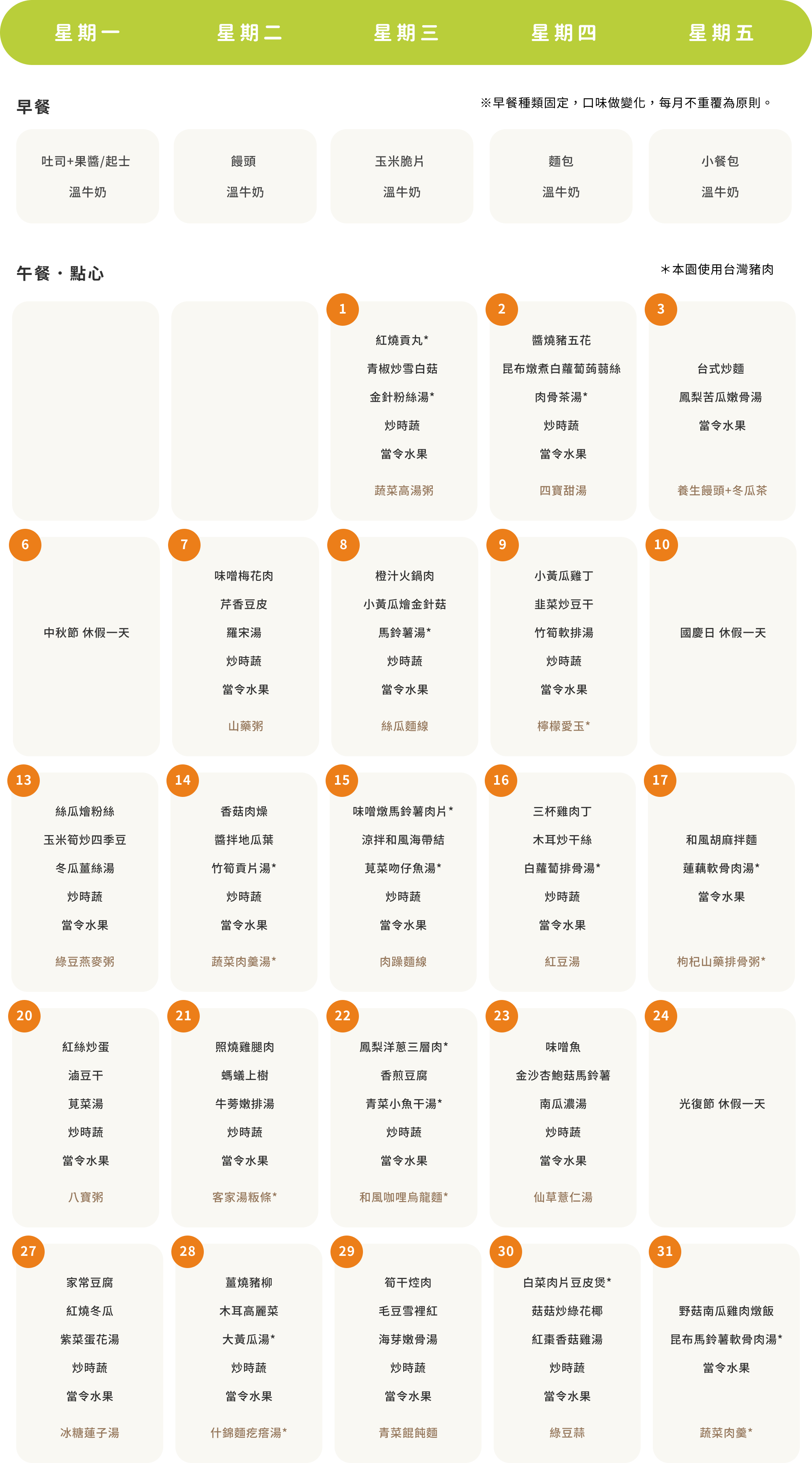 ※早餐種類固定,口味做變化,每月不重覆為原則。